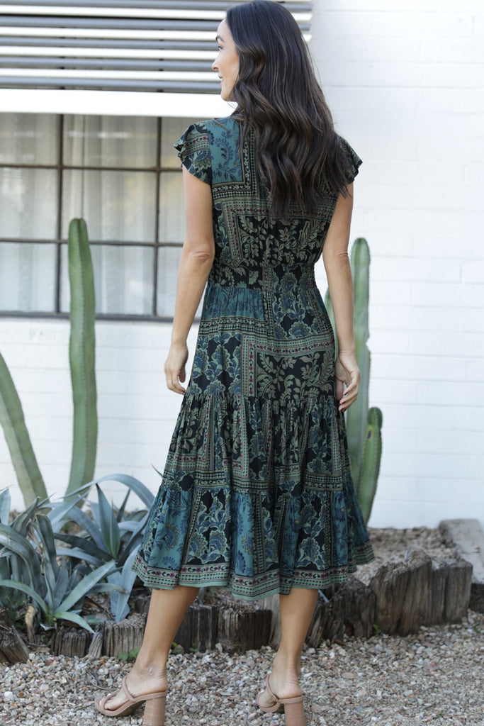 Tiered Dress with Flutter Sleeves ~ Green Print